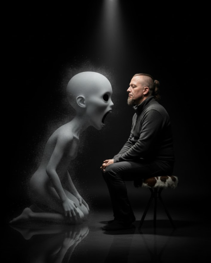Ich spürte eine Präsenz auf meiner linken Seite und ließ mich von dem Gefühl treiben und ziehen. Es war, als ob ich Karussell fahren würde. Ich blickte vor meinem inneren Auge nach links, und da sah ich es. Es war ein Wesen mit einer Glatze, tiefschwarzen Augen und einem weit aufgerissenen, nennen wir es, Maul. Dieses Ding schrie mich förmlich mit seiner ganzen Energie an. Die Energie war so stark, dass ich von mir aus auf die rechte Seite meines Körper/Geistes abdriftete. Meine Wahrnehmung ging in den Hintergrund, und als die Seminarleiterin meinte, ich solle sagen, wer das Wesen ist, entstellte sich mein Gesicht und meine Stimme veränderte sich. Ich nahm noch wahr, wie zwei bis drei Teilnehmer im Raum erschraken und die Worte fielen: "Oh Gott, was ist denn hier los? Das macht mir aber Angst." Ich sollte antworten, wer dort neben mir auf der linken Seite steht und mich anschreit. Als Antwort auf die Frage gab ich mit einer anderen Stimme die passende Antwort: "Das geht dich nichts an!!!" Die Antwort war so vibrierend, dass ich noch weiter geistig in den Hintergrund trat und alles wahrnahm wie in einem Film, der von außen als Kameramann gedreht wird. Eilig standen die Seminarleiterin und eine bereits fortgeschrittene Schülerin neben mir und begannen, ihre Hände über mich zu legen. Es ging alles sehr schnell. Mein Blick, die Stimme und alles andere glitten wieder ab, und mein Kopf bewegte sich Richtung Decke. Innerlich würde ich es so beschreiben: Es war, als ob die Sonne über mir aufging, es wurde hell und still um mich herum.